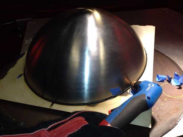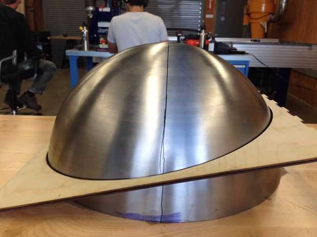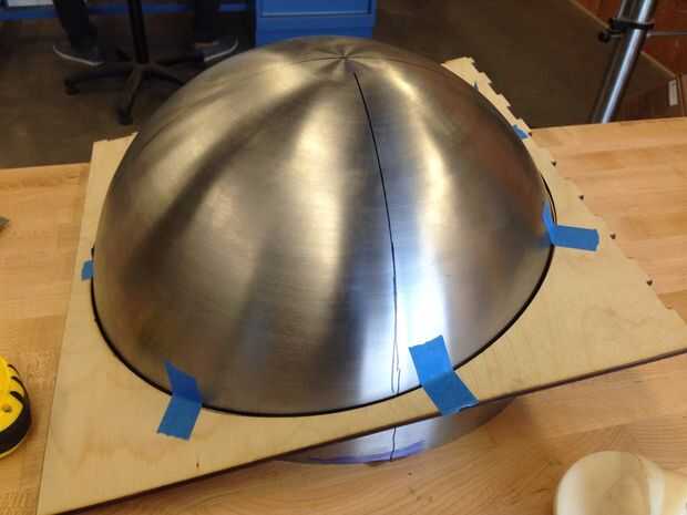 Tuve que cortar una cuña pequeña sección de un hemisferio para caber y mis habilidades en el chorro de agua Omax no eran sin embargo la tarea haciendo un corte de 5 ejes. Por lo tanto, tuve que recurrir a la cortadora de plasma para que funcione. Un láser patrón se hizo, se deslizó sobre el hemisferio y usando un buscador de ángulo, el modelo fue ajustado a la dimensión del ángulo de la modelo de la computadora. El patrón de madera actuó como una guía y la antorcha viajado alrededor de la cúpula para hacer el corte. Después de un poco de pulido para limpiar el corte, las piezas se encajan entre sí.