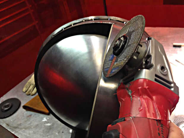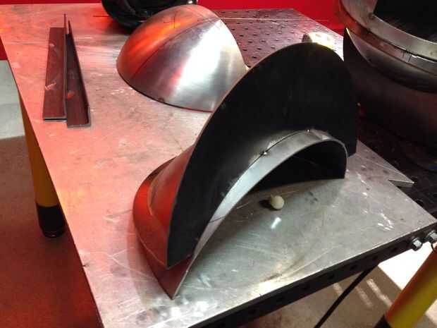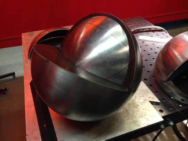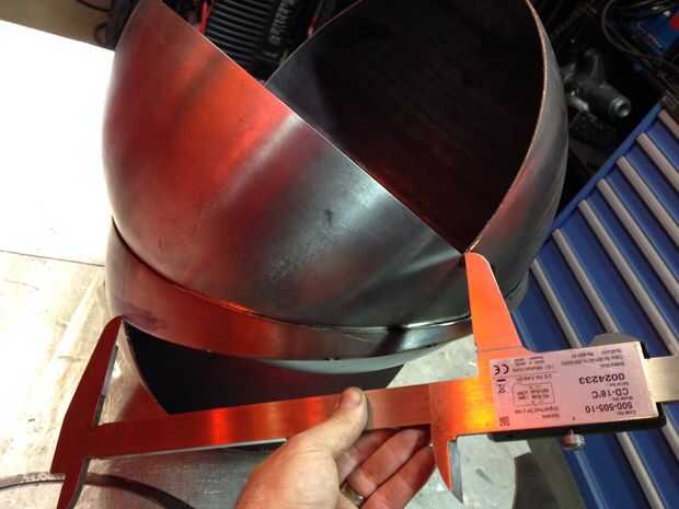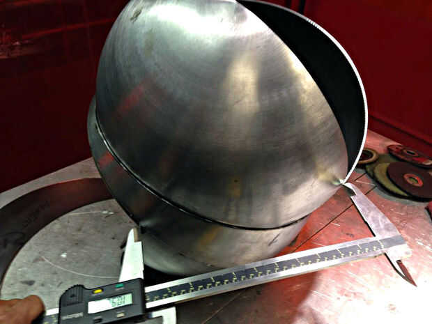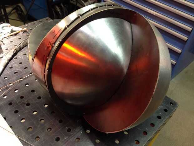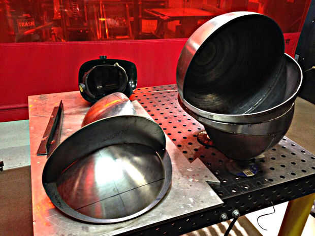 Ahora que todas las partes fueron cortadas, era tiempo para encajar la pieza y comenzar a soldar. Las secciones hemisféricas se registraron midiendo cuidadosamente entre puntos conocidos y luego tachuela soldada. Patrones planos se viraron en secciones y después fue montar toda la pieza. Todos los empalmes necesitan para estar preparados para la soldadura por lo que las costuras eran biseladas con una amoladora. Realmente debería haber hecho esto antes de Asamblea pero yo estaba impaciente por ver la pieza juntos. Entonces empecé a saltar toda la pieza de soldadura. Skip de la soldadura es una técnica utilizada para distribuir la tensión de la soldadura sobre el trabajo para minimizar la distorsión. "Puntadas" pequeñas aproximadamente 1/2" de largo fueron soldadas a intervalos constantes a lo largo de todas las articulaciones. Cuando saltar turno soldadura la pieza con frecuencia para minimizar los focos y evitar que el metal desviar. Teniendo en cuenta la fuerza relativa de las formas hemisféricas y la naturaleza perdonadora de acero suave, estaba preocupado de que el metal se distorsionan demasiado.