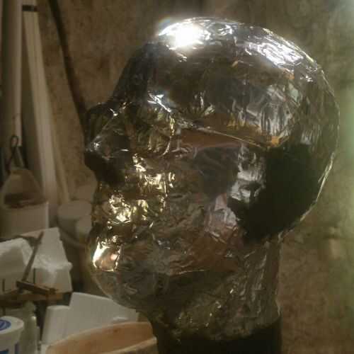 Este es el molde de la cabeza. Fue hecha por cubrirme la cabeza con pantimedias de nylon, como un ladrón de bancos y cubrir con dos capas de cinta, como pegajosa de aluminio (disponible en tiendas de parte de auto). Me cortan fuera de la cinta, la capa de la manguera panty fue quitada, y el caparazón cubierto dentro con una capa de yeso de París. Cuando eso fue fuerte, llené el resto de la cavidad con lechada y trozos de espuma de poliestireno, para reducir el peso y había montado sobre una base y cuello de tubo de PVC. El resultado final es una forma sólida que resiste la presión mientras la escultura de la arcilla sobre él.
