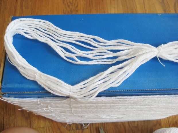 Cuando el hilo se envuelve empezar a atar en grupos. Até mina en 10 paquetes de hilo. Dos cosas van en esta decisión. En primer lugar, el número de bucles es cuánto podría tener que desenredar en un momento. En segundo lugar, cada grupo va a ser una sombra en el ombre. Más grupos se traducirá en una variación de color más sutil. Atar firmemente bastante para mantener la cadena unida, pero no tan firmemente como sea posible ya que puede evitar que el tinte de llegar al hilo.