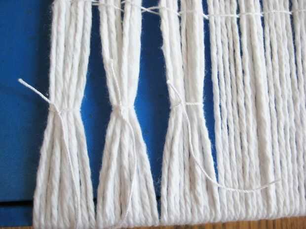Cuando todos los grupos están vinculados una vez, iniciar el desplazamiento fuera de la caja y volver a atar sobre el centro de los lazos. Si los bucles son muy grandes puede más lazos.