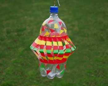 muy hilandero del viento del simple hecho de una botella de agua plástica, cinta adhesiva y una caña de bambú.Todo lo que necesitas hacer es cortar un agujero en la parte inferior de la botella, aproximadamente 1cm de diámetro (dependiendo del diámet