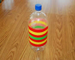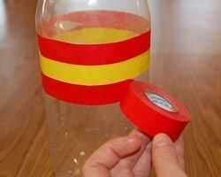 Ejecutar longitudes de cinta aislante de colores alrededor de la mitad de la botella de pop, como se muestra. Esto también ayudará a cualquiera de la etiqueta que aún podría pegado en tapa.