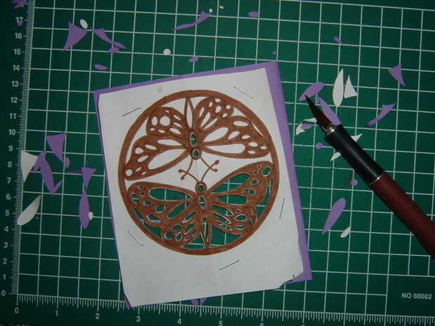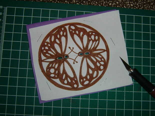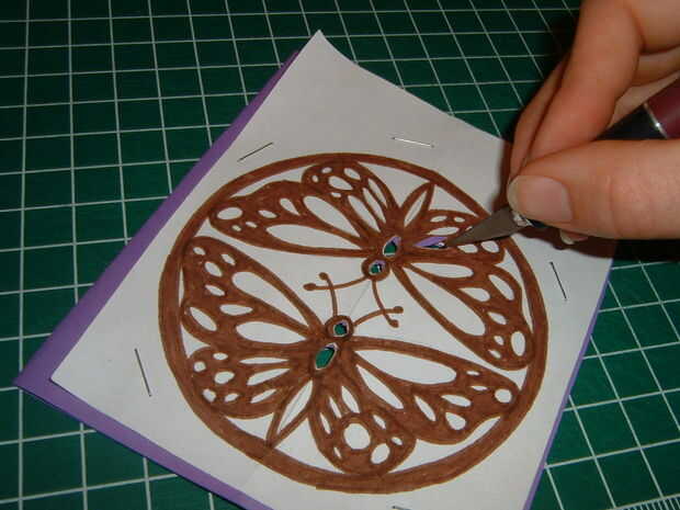 Colocar el papel encima de un auto-sanación mat y sostenga que su cuchillo x-acto como tú sería un bolígrafo o un lápiz. Básicamente va a ser recortar las piezas que no son parte del diseño. Por ejemplo, con los patrones que he diseñado, oscureció las áreas que por lo que sólo puede cortar las partes blancas. También es útil comenzar hacia el centro del diseño y su forma de trabajo hacia fuera. Tiendo a cortes más pequeños primero y luego trabajar hasta las partes más grandes. Sólo ayuda a mantener todo estable durante el corte.