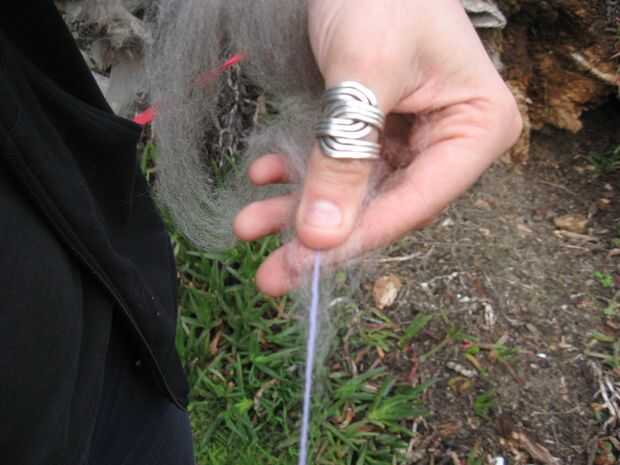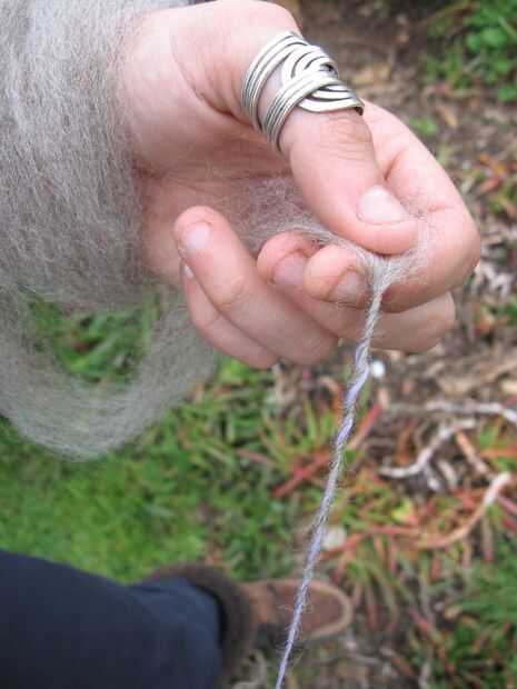 Embromar hacia fuera algunas fibras desde el extremo de la mecha y sostener junto con el final de su líder con la mano izquierda. Con la otra mano, dar su huso una buena vuelta en sentido horario y dejarlo colgar, manteniendo su mano izquierda pellizcando juntos líder y fibra. Usted notara la fibra de torsión sobre el líder. Que el líder se acumulan una buena cantidad de giro, entonces "Parque" su eje manteniendo el eje entre las rodillas.