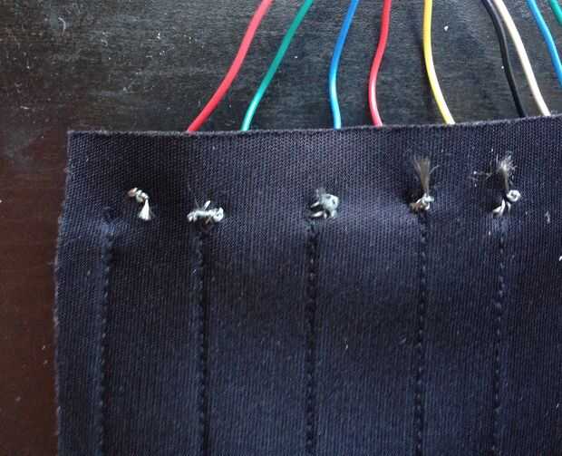 Mano coser los extremos de hilo conductor en el bucle correspondiente de los cables conectados a la placa del sensor. Asegúrese de hacer varios bucles para asegurar una fuerte conexión. Recorte el hilo sobrante para asegurarse de que no hay ningún sueltos tocando los otros rastros.