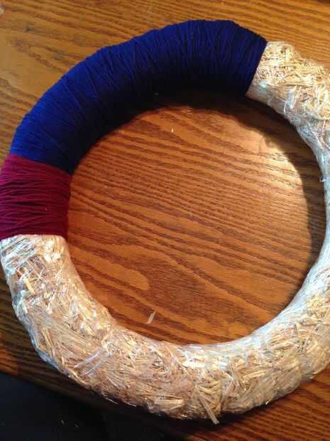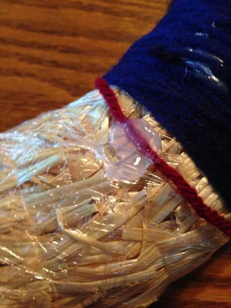 Al comenzar a enrollar el hilo rojo y blanco para darle el aspecto rayado, debe comenzar con el hilo rojo. Al hacerlo, usted quiere conseguir el hilo rojo listo para envolver pegando el extremo del hilo rojo hasta la corona de paja con el pegamento caliente, tal como lo había hecho con el hilo azul. El hilo debe pegar abajo cerca de la zona final del hilo azul. Una vez que el hilo rojo es seguro y el pegamento está seco, puede comenzar a envolver el hilo rojo alrededor de la corona de paja tal como lo había hecho con el hilo azul.