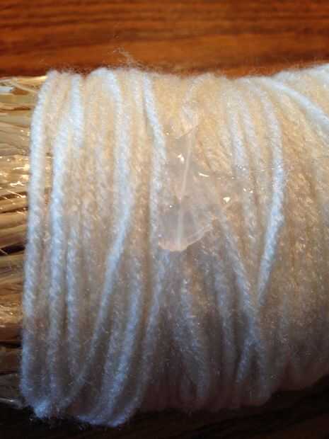 Al envolver el hilado blanco, quiere pegar el extremo del hilo a la parte trasera de la corona paja usando pegamento caliente, tal como lo había hecho con el hilo rojo y azul, pero con el fin de ser pegado abajo casi al final del hilo rojo de embalaje. Una vez que el pegamento esté seco y el hilado es seguro, puede empezar a envolver.