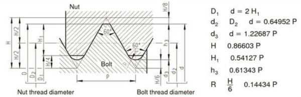 - Podría esperar un perno M10 de 10,0 mm en las puntas de los triángulos que forman el hilo. Esto no es cierto. Es 10,0 mm a través de los planos que existen en las puntas de los hilos. El perfil de la rosca no es un triángulo. Es un triángulo plana donde el triángulo ha sido cortado en 1/8 de su altura. (La anchura de la plana es por lo tanto 1/8 de la echada del hilo de rosca).
