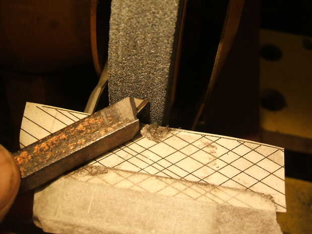 Después de mucha tortura mental, trabajé a qué ángulo el HSS acero tuvo que ser celebrada, la amoladora, para crear la forma deseada. Pues yo utilizaba el software de autoedición para producir un montón de líneas paralelas en los dos ángulos es necesarios (véase las fotografías). Me pegan estos en soporte de la herramienta amoladora y luego trabajaron para mantener la herramienta alineada en todo momento. Tiene un ángulo de soporte de la herramienta en una manera de producir algún alivio, cuando la herramienta se sujeta firmemente de la herramienta (pequeña) (5 a 10 grados?). Yo debo producir una plataforma más grande para la amoladora!