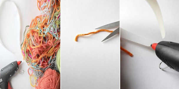 Preparar los hilos en diferentes colores. Cortar una cadena de hilado con la longitud apropiada. Un poco del pegamento en un extremo del aro pelo.