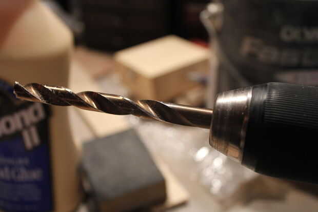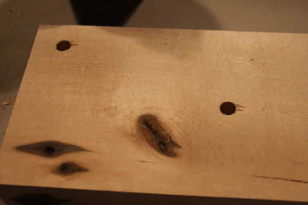 Ahora toma tu 3/8" bit y perfore dos agujeros en su bloque de madera. Mente la altura de su madera. Mina era cerca de 1.5" y tuve un montón de espacio para perforar. Desea por lo menos 1/4" profundidad en su agujero. Taladro lo más recto posible-un taladro asegurar esto, pero nosotros no estamos construyendo un cohete o una mesa de café somos nosotros. Tambaleó mis agujeros. El agujero para la bobina centrada en el yo y el agujero para el gancho alimentación puse en uno de los rincones.