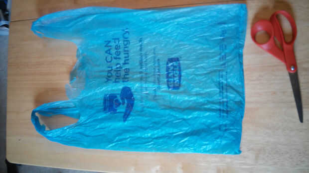 una manera aseada para reutilizar esas molestas bolsas de plástico que acaben rampantes en todo el mundo.Se necesita:* tijeras* bolsasTome una bolsa de plástico, doble plana para doblar la pieza de la manija plana también.Tomar un extremo y doblar un