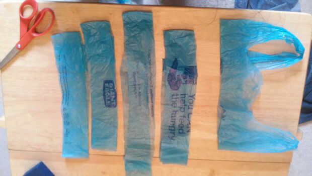 Mi siguiente paso fue cortar horizontalmente la bolsa de plástico en tiras de 2".