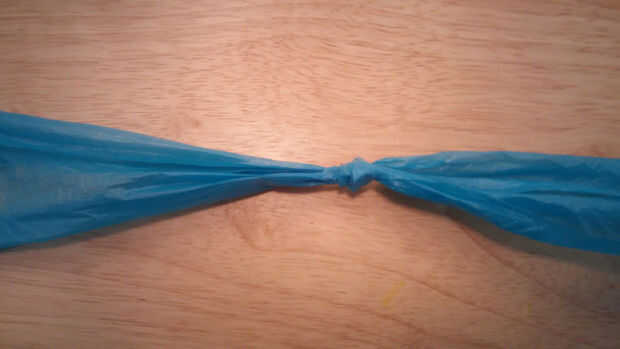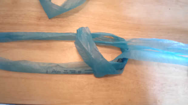 una manera aseada para reutilizar esas molestas bolsas de plástico que acaben rampantes en todo el mundo.Se necesita:* tijeras* bolsasTome una bolsa de plástico, doble plana para doblar la pieza de la manija plana también.Tomar un extremo y doblar un