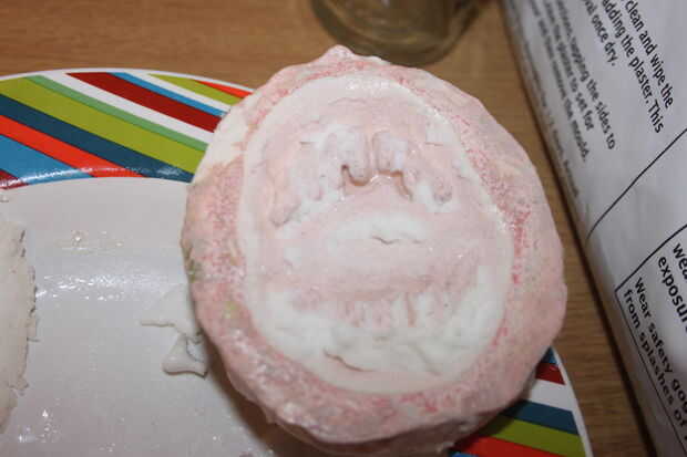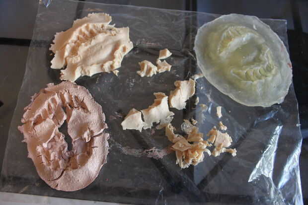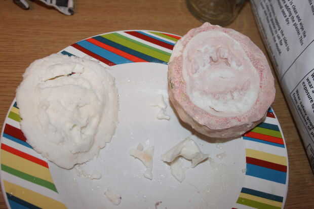 Si usas gelatina hecha espuma directamente sobre el yeso de París con un agente de moldeo se adhieren todavía a su molde y no funciona muy bien como se puede ver, por lo tanto recomiendo pegarse a la mezcla de gelatina recta o látex para hacer su prótesis.