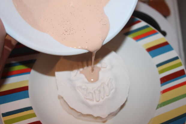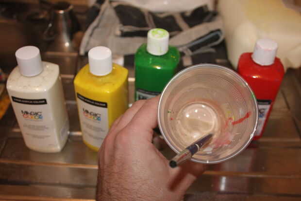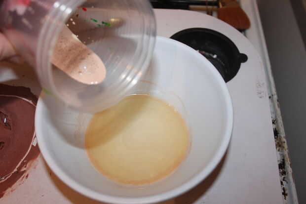 Utilizar una pequeña cantidad (5 gotas) de pintura acrílica color gelatina para color de la piel pero puede debilitar la prótesis por lo tanto alimento colorante funcionará igual de bien.