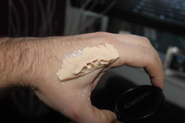 Siempre trate de una una prueba de pieza en la mano primero y tratar de color maquillaje y lo que hace que pegue.