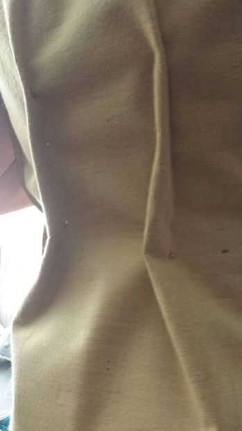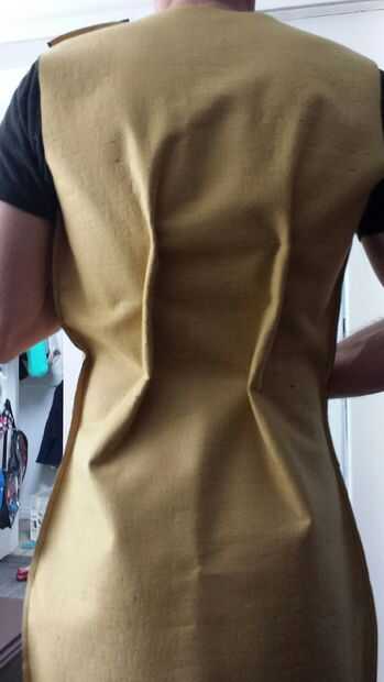 Esto es donde nos topamos con un problema. El chaleco se ajuste bien contra mi pecho, pero no mi cintura. Mi esposa, siendo la mujer brillante que es, sugirió que ponemos las pinzas en la parte trasera para ajustar el chaleco a mi cuerpo. Fui junto con su genio. El revés del chaleco y tira y cubrió dos dardos para obtener la medida. Una vez que se hizo nos llevó aparte para asegurarse de que les centrado tenemos y uniforme. Entonces ella cosió en los dardos con resultados asombrosos. Si ajuste perfectamente ajustado.