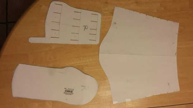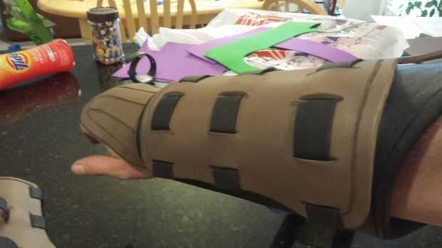 Comencé con la fabricación de los patrones de cartulina. Éstas se midieron contra mis brazos y dibujados hacia fuera basado en las fotos de referencia. Empecé con la espuma de EVA de 1/2 como base. Pegan los bordes y lo intentó. Una vez que lo tenía guarnición justo rociaron con un par de capas de PlastiDip. Esto me dio referencia de donde colocar la cubierta de la mano. Utilicé una técnica similar como lo hice con el bajo acolchado en la hombrera. Usando un cuchillo Xacto yo cortar los patrones en la espuma, calienta y entonces formado a mi mano. Esto luego fue pegado en la base...
