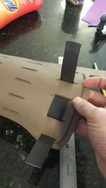 El siguiente fue el tirantes. Me corte los listones en esto y usa una dremel en los bordes para suavizar los cortes. Luego, con 2 mm de espuma de artesanía, había creado las correas para esto. Ellos fueron rociados con PlastiDip así sería negro y aspecto de cuero. Estos luego se teje dentro y fuera de los agujeros. Entonces esto fue pegado a la base, también seguí las correas alrededor de la base y añadidos clavos para ver como puntos de enganche.