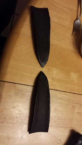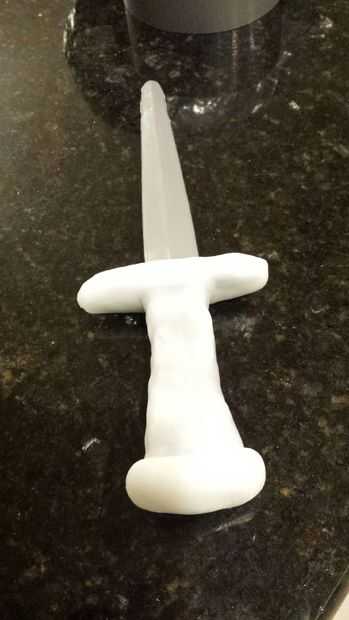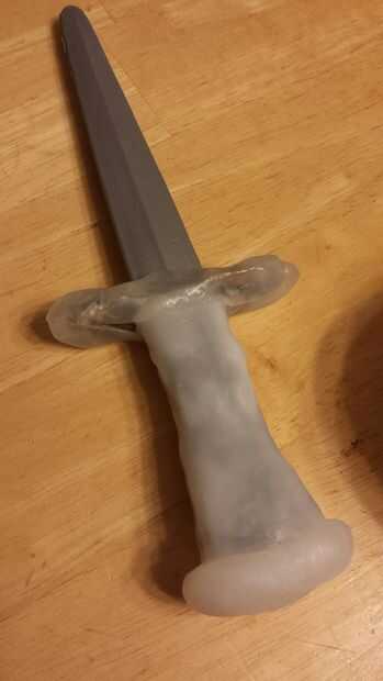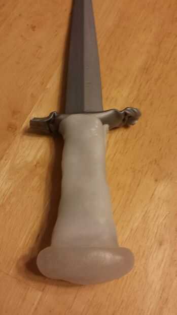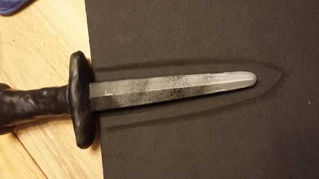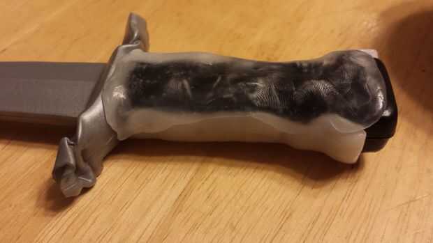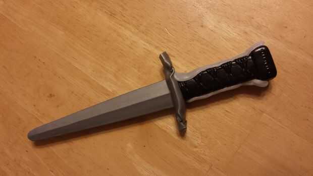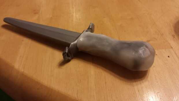 Para que el cuchillo, realmente esperaba encontrar un buen cuchillo de tienda de dólar. Realmente no tengo suerte con esto, pero encontramos un Sai. Corte los bordes exteriores y había derretido en forma. Luego, usando InstaMorph, formó una empuñadura para ver como cuchillo de hipo. Una vez había encontrada la forma, rociaron todo con la pintura de aerosol metálica. He creado la vaina 5mm negra espuma.