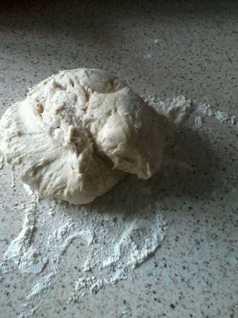 Una vez que la pasta empiece a formar una bola, raspa fuera su tazón, sobre una superficie cubierta de harina. Amasar harina, hasta que la masa deje de pegarse a las manos y es formable.