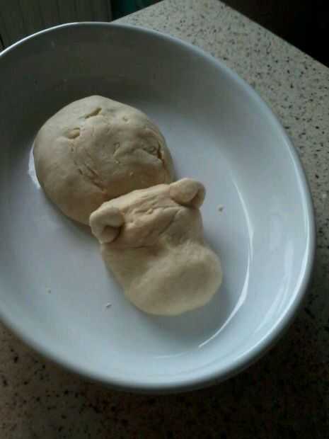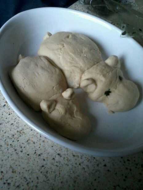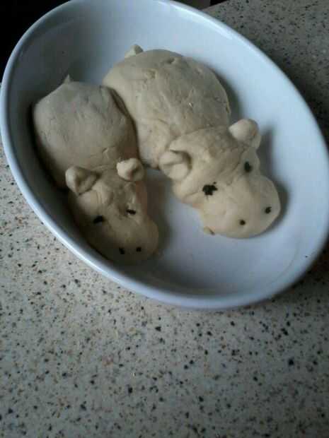 Para los HIPOPÓTAMOS se toma una pieza de tamaño de un puño de masa. Cortar aproximadamente 1/3 de su trozo de masa y forma la broca de la cerveza en el cuerpo de un hipopótamo. (Rellenar con queso, pedazos de cebolla, bacon,... a tu gusto.)