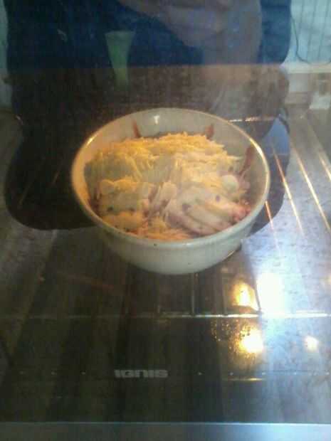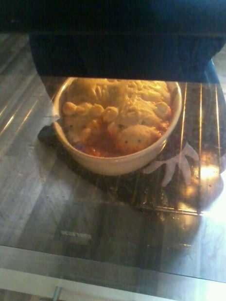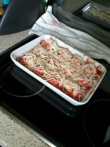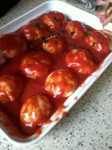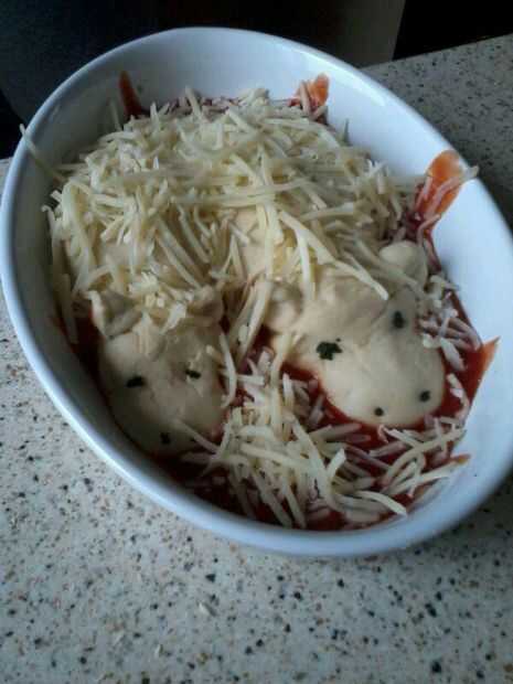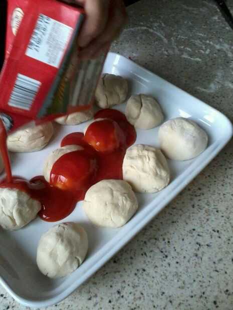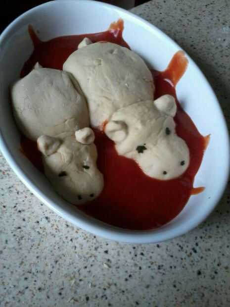 Para los hipopótamos cuidadosamente verter la salsa de tomate a su alrededor. Añada los ingredientes a tu gusto a la salsa. Aproximadamente cubren la salsa y los hipopótamos con queso, pero tenga cuidado de dejar la cara libre, por lo que todavía pueda reconocerlos. Entonces están listos para hornear.