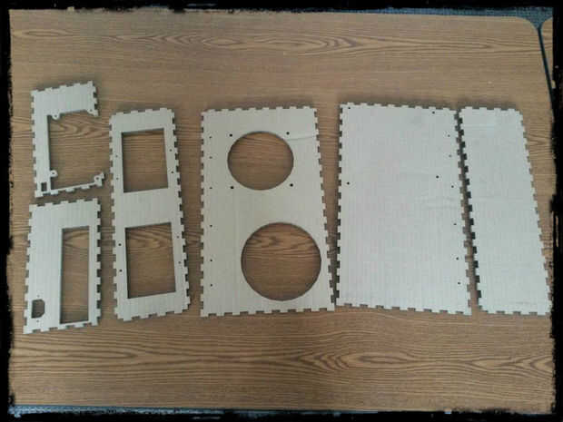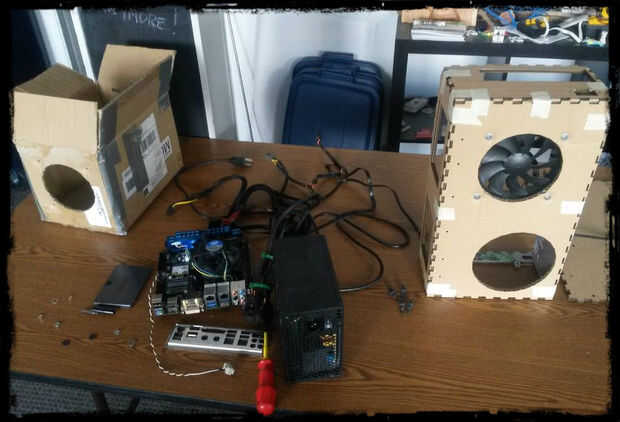 Primero cortar todas las piezas de cartón, probado de ellos y el fijo los que estaban equivocados. Este paso tomó el más largo de todo el asunto. También metí la ubicación de la placa base un poco, así que no pude poner el un disco duro donde había planeado. He tenido que rehacer varias partes 4 o 5 veces en la cartulina antes de que se ajustan lo suficientemente bien como para ensamble y corte de madera contrachapada de 1/4"(que es en realidad 3/16: grueso).