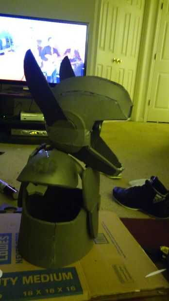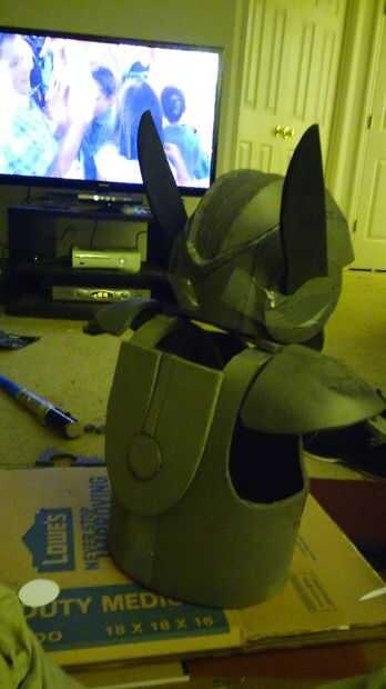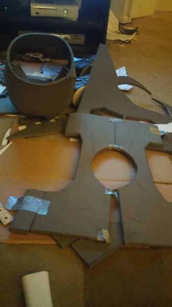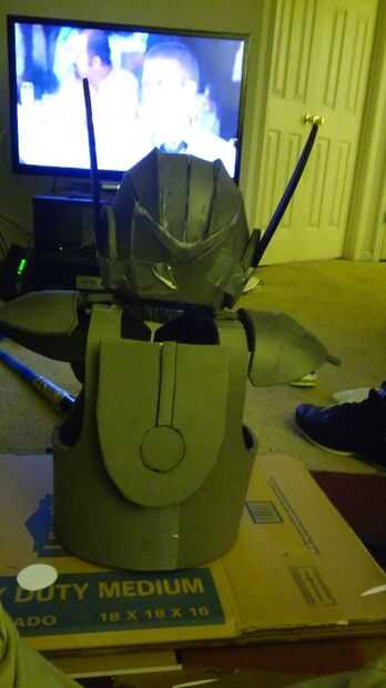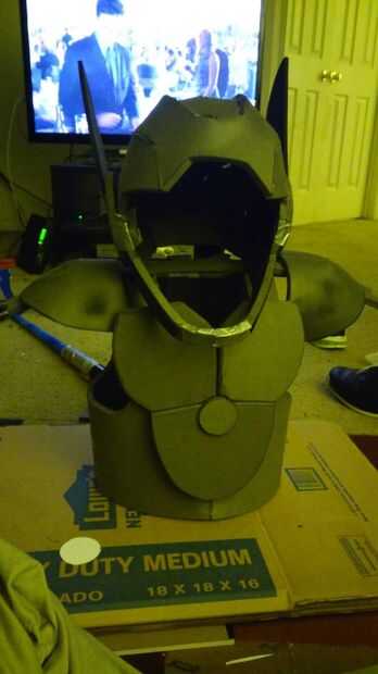 Ahora que tenía casco de hecho fui a lo que yo pensaba que sería fácil la armadura. I tratado como un tablero de emparedado de la espuma de EVA y a recortar el orificio central y añadido de espuma para que se ajuste. Esto fue muy bien en teoría pero no había manera que despegar una vez que fue. Yo había estado utilizando cinta adhesiva hasta que pude averiguar de una manera de enganchar juntos. Fui hacer los cojines del hombro. Cortar óvalos luego cortadas una rebanada a ellos alrededor de la curva para hacer la forma que esta hecha una copa extraña forma que doblado y moldeado con la pistola de calor hasta que consiguió la forma que quería. Hice dos de ellos y los comprometidos. Entonces decido utilizar a cada uno como uno de los botones y corte un triángulo en forma de pieza para poner debajo de ellos. No fui por la película dibujo pero el diseño original del bosquejo por los creadores que encontré en línea. Cortar las piezas de pecho y la espalda piezas de espuma de EVA de las formas que sacó en cartulina. Entonces usé dremel para redondear los bordes y todo liso hacia fuera. Así ponerlos todos juntos y consiguió la armadura va. 10/10 6 días a la izquierda.