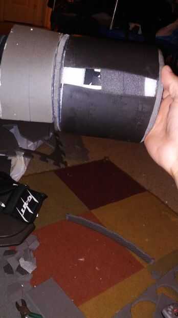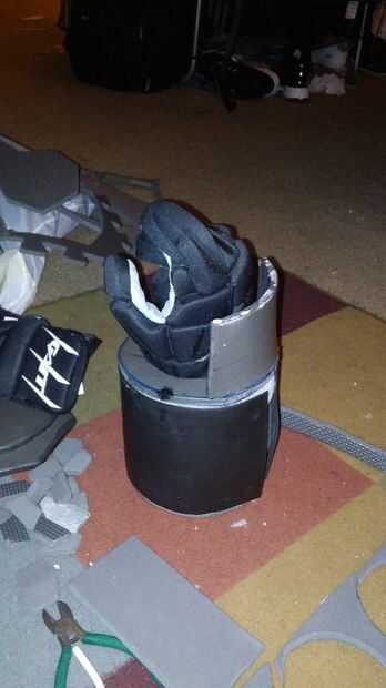 Guantes o guantlets fueron una de las cosas claves que había querido hacer cuando empecé. En la película y dibujos son sobre exageradamente grande y quería capturar eso pero casi todos eran publicar sólo lanzar una pieza de EVA en sus antebrazos y poner guantes con tal vez algunos segmentos de espuma en ellos. Decidí ir otra ruta y buscado guantes de lacrosse. Guantes de Lacrosse parecen robot enorme manos y acolchadas en los dedos que parecía similares a lo que viste en la película de Hiro. Siempre he pensado que Hiro parecía que llevaba equipo de Lacrosse de todos modos así que fui a mi tienda local de Lacrosse (por suerte tenía uno) explicó al Secretario lo que estaba haciendo y él me enganchó para arriba con un par de guantes blanco y negro por $15. Tenía los guantes pero tuvo que ingeniárselas hacer la parte abultada alrededor de los antebrazos. Para esto que fui a Hobby Lobby tiene 4 anillos de espuma redonda grande que mi brazo hijos podría encajar bien, entonces conseguí 6 palitos de galleta y pegados por los anillos de espuma y construir una forma de cilindro, luego tuve algunos espuma de aislamiento de la ventana y llena el espacio entre los dos anillos y wraped todo en el 1/8" hoja de la espuma (esto realmente deseo que había tomado fotos mientras estaba de construcción). Esto hizo el guantlets robusto y ligero. Entonces necesitaba un ascensor emocional por lo que tuve a mi hijo a probar todo y entonces se vale.