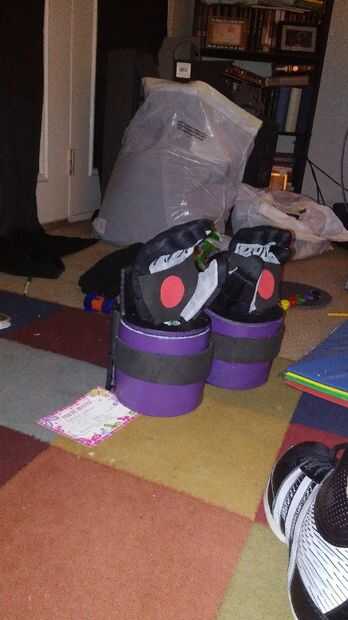 Casi olvidaba que creó la banda de las porciones de conexión las almohadillas EVA había cortado como chatarra. Hice un fastern oculto en él y las correas de hombro así que él podría tomar traje encendido y apagado. Rodilleras había sólo cortar espuma y cortar pedazos de espuma redonda y pintado. Hice algunos cortes de rebaje para el círculo de centro rojo en su armadura. Originalmente había hecho un diagrama de cableado para hacer todos los círculos rojos como luces de LED, pero no tenía tiempo para cablear todo.