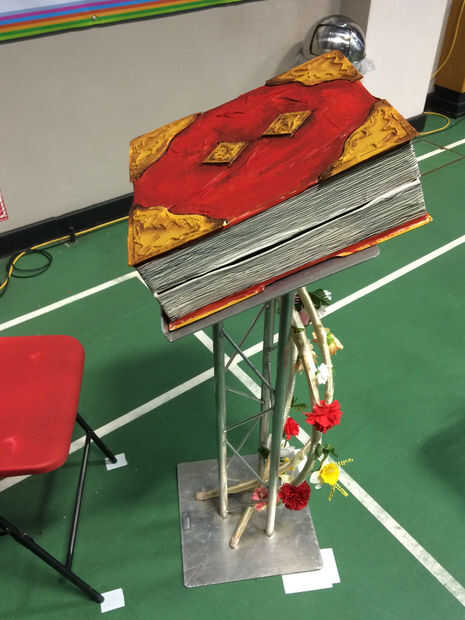 Montamos el libro en un atril que fue decorado con flores y cintas. El libro también fue utilizado como un transporte sobre la prop.
