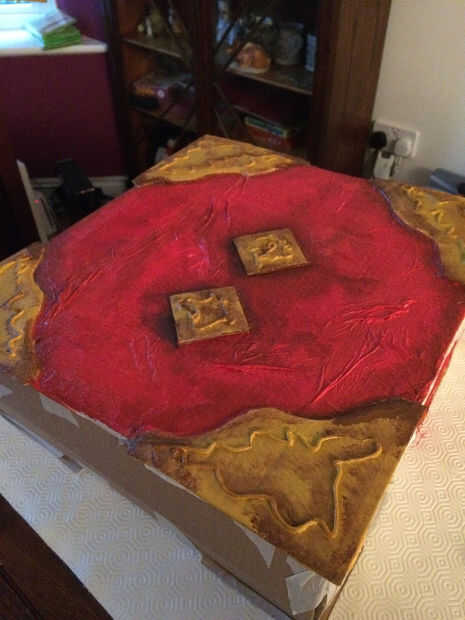 Empezar con un agradable color rojo anaranjado brillante y luego como se en capas hasta los tonos más oscuros, añadir en algunos carmesí para crear un acabado de tipo cuero rojo antiguo. Tenga cuidado donde el rojo se encuentra con el oro. (Pensando en podría colocar las esquinas oro en luego, pero me gustaba con la cinta de enmascarar arrugada todo el libro, así que en la construcción desde el principio fue necesario). También usé gotitas de pegamento seco que más alivio remolinos y formas y pintura acrílica va sobre estas gotas muy bien.