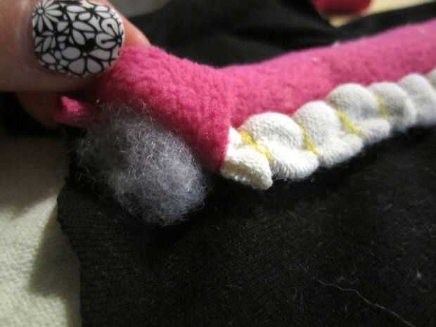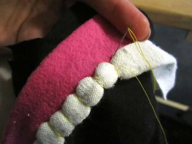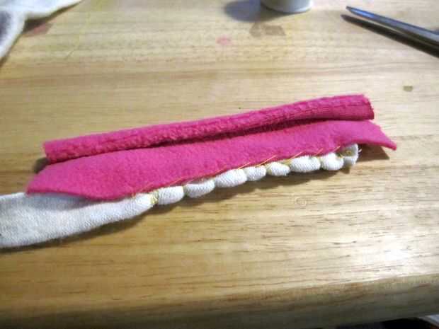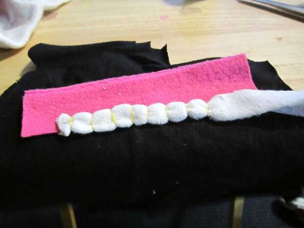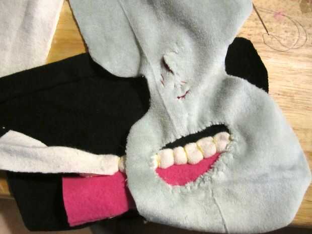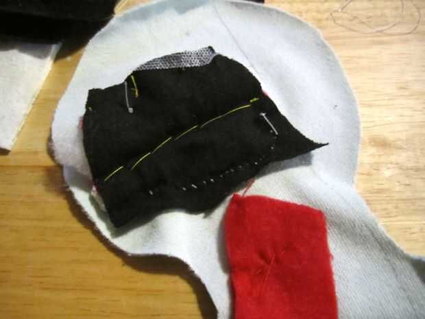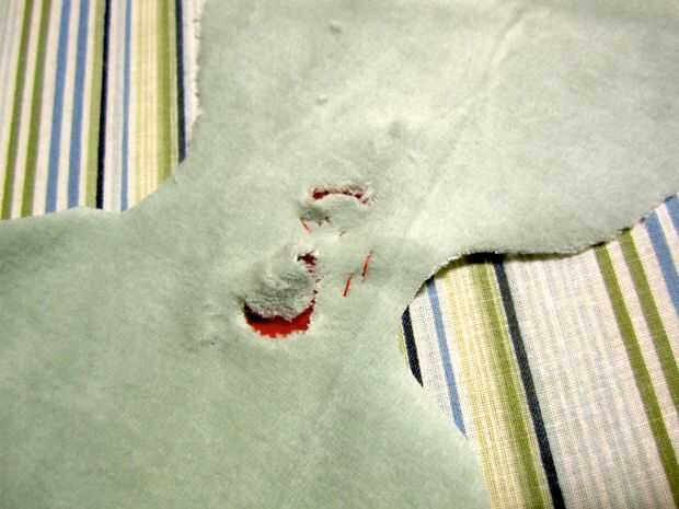 * En cualquier lugar que desee agregar arrancó carne, cortar un agujero y coser la tela roja detrás de él. Pasa nada si el hilo de rosca rojo muestra a través de si que se vea como arañazos.