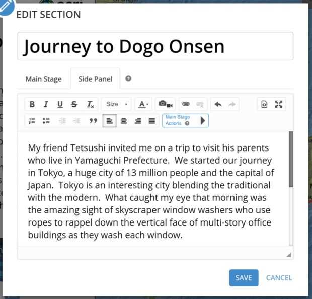 También puede enlazar palabras o frases a llevar el espectador a otro sitio web para obtener más información. Trato de reducir mi uso de ligarse a otro sitio web, como mis invitados a explorar la historia mapa diario y no seguir un enlace a otro sitio cuando sólo están parcialmente a través de mi historia mapa diario. Sin embargo, para fines de ilustración se incluyo un enlace en mi demostración historia mapa diario que le llevará a otro sitio Web.