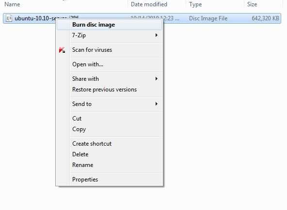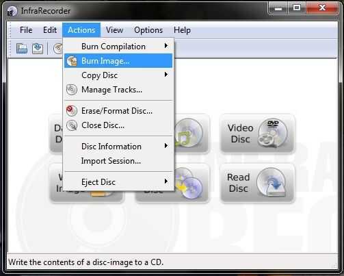 Ahora que tienes una copia descargada necesita grabar la imagen ISO en un CD. Si tienes Windows 7 solo haga clic derecho sobre el archivo descargado y elegir Grabar imagen de disco. Cualquier otra versión de Windows, necesitará descargar el software de terceros para grabar la imagen. Te sugiero usar InfraRecorder.