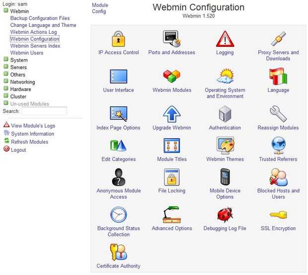 - En la izquierda es un conjunto de enlaces, ampliar el enlace Webmin. Ahora eligió a Configuración de Webmin