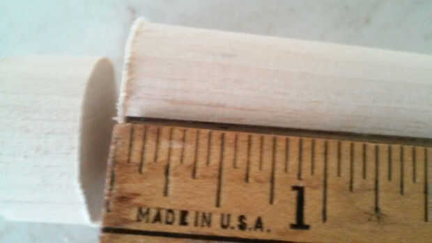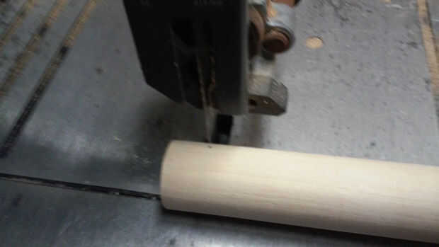 Para hacer las piezas, recortar secciones de la espiga de diámetro de 1 pulgada. Me marcó la espiga longitudinalmente cada media pulgada y luego cortarlo con una sierra de banda hasta que tuviera 36 piezas.