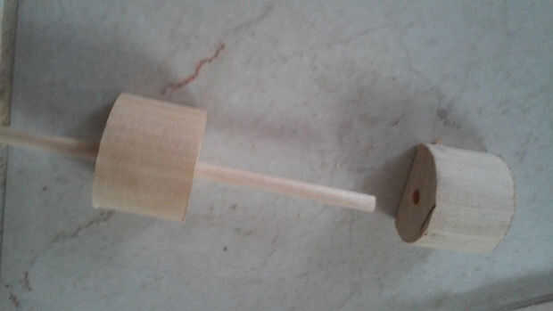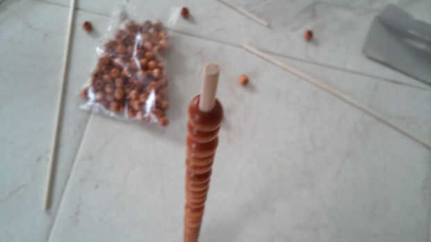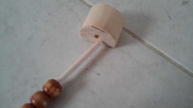 Los granos de madera ya tenían 1/8 de pulgada los orificios perforados en ellas, pero no era exacta, así que terminé vuelva a taladrar los orificios en 25 pequeñas cuentas de madera, que era mucho más fácil de lo que suena. La idea es conseguir que montar en uno de los tacos más pequeños. El debe deslizarse fácilmente a lo largo de él, si no lo hace, o perforar el agujero un poco más grande o arena hacia abajo el pasador. Terminé haciendo dos...