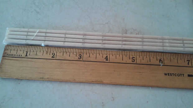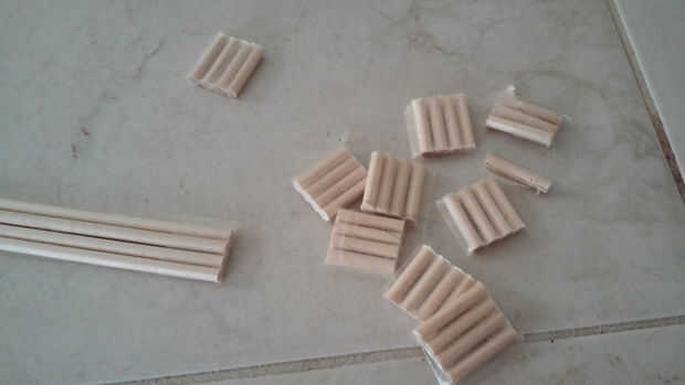 Para hacer las clavijas para las piezas, grabado 4 de los taquetes de 1/8 de pulgada, entonces mide y cortarlas en 3/4 de pulgada pedazos. Lo hice hasta que tuve 36. Entonces corté uno más en una pulgada completa porque mi rey pieza es 1/4 de pulgada más alto.