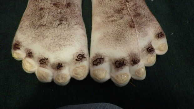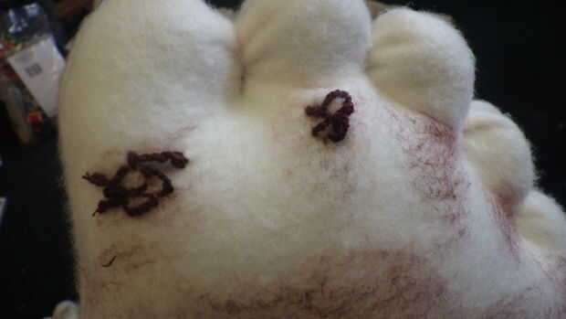 * Para cabello más grueso del dedo del pie hice ganchillo lazo trenzas con hilo y aguja y había cosido en su lugar. Una vez que tuve todas diez dedos cubiertos regresó con pintura y hace manchas oscuras en los dedos del pie y dio la ilusión si más grueso pelo en la parte superior con capas de pintura. (Foto 2, 3 y 4)