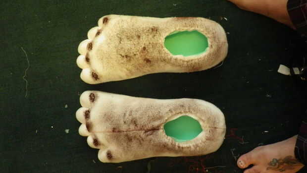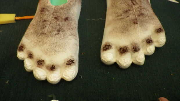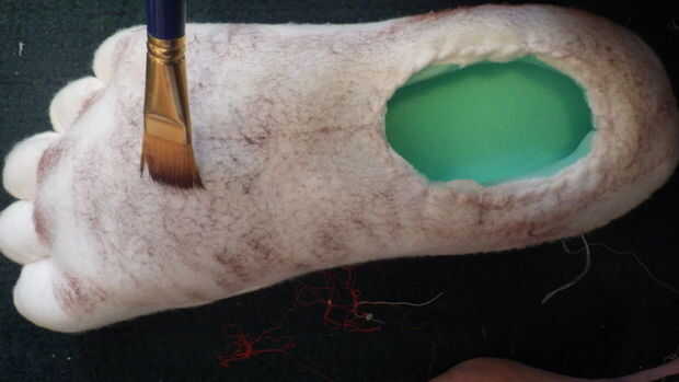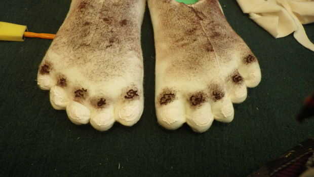 * Para que los pies luzcan furry usé un cepillo de cerdas duras y acrílico marrón seco. Para empezar he utilizado pequeñas cantidades de pintura en un movimiento de remolino con el cepillo. Pinté la parte superior del pie y alrededor del lado y la parte posterior del orificio del pie. El último lugar añadí pintura era a la parte superior de los dedos del pie donde sería pelo del dedo del pie. (Foto 1)