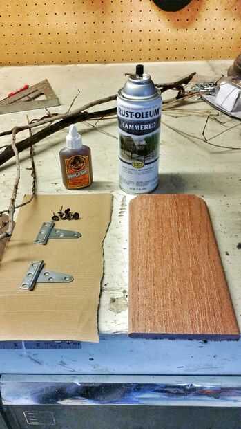 He encontrado una fina 5' compuesto cubierta material en el compartimiento de corte por $3, entonces fue a hardware y encontrar las bisagras puerta tipo más pequeño que pude. Pensé que algunos pintura hammertone les daría un acabado apropiado. Luego encima era algo que parecía vieja-timey para pernos de bisagra - algunas chinchetas de latón antiguo llenan el proyecto de ley muy bien.