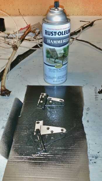 Siguiente fue pintar las bisagras por lo que podría secar mientras comencé a pegar los de la puerta. Creo que hammertone oscuro parece hierro viejo y se adapta el aspecto del proyecto.