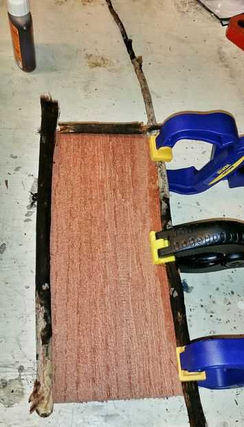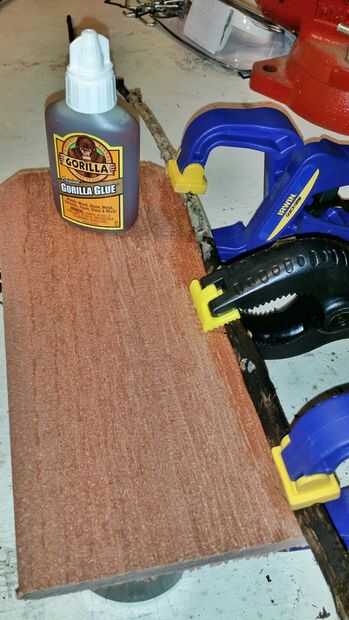 Algunas de las ramitas cortadas la longitud aproximada de la altura de la puerta y moje un extremo de la puerta antes de ejecutar una tira fina de pegamento. Pegamento del gorila expande un poco lo uso con moderación o se abombe y necesitan ser limpiados para arriba. Puso la ramita en él y sujeta cada extremo, luego agregó un poco dobla y sujeta el centro.