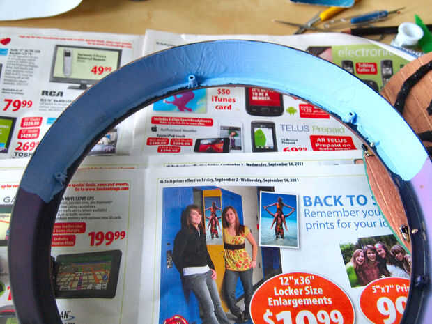 Dependiendo del ángulo en el que se mire la puerta puede ver el interior del marco por lo que he pintado una luz azul para el cielo y la luz verde para el suelo. Usé la imagen felted como guía para donde comienza el cielo.
