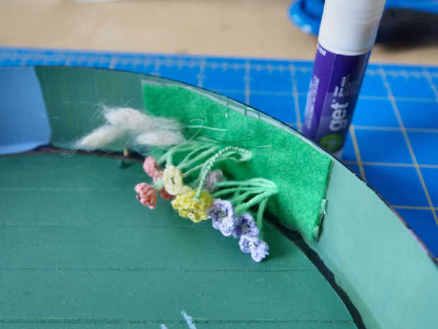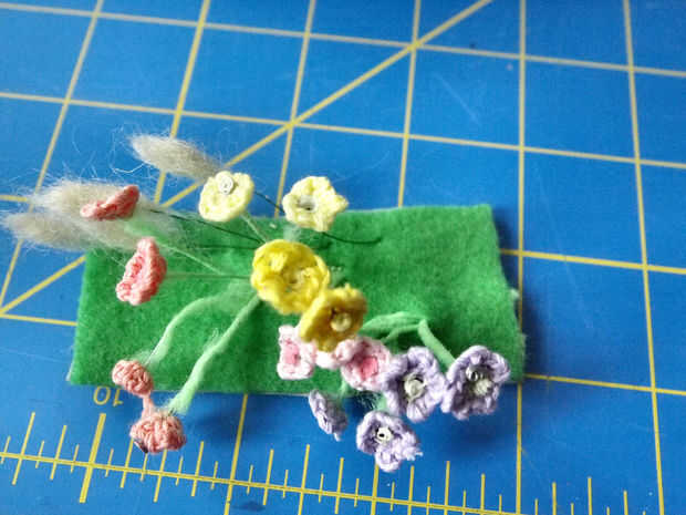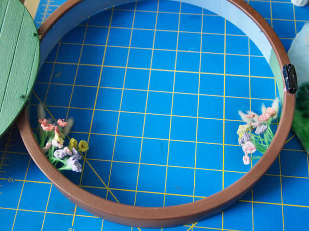 usé una pequeña pieza de arte verde para sujetar las flores por meter agujeros en él y arreglar las flores en los paquetes. Había dividido las flores que hay números aproximadamente iguales de cada lado de la puerta. Los morados y rosas son hacia el frente, rojos y amarillo hacia la parte posterior, rojos más arriba y las hierbas son en la parte posteriora lejana sino el más alto. Grabado en la parte posterior de la nave de fieltro con cinta aislante para unir todo. Cortado la cinta sobrante y alambre que sacó. Luego pegué el pedazo de fieltro lleno de flores en el interior del marco de la puerta. Debe estar situados a ambos lados de la vía que conduce fuera de la puerta.