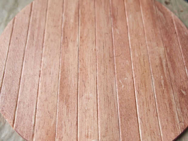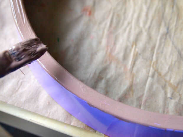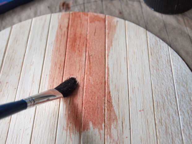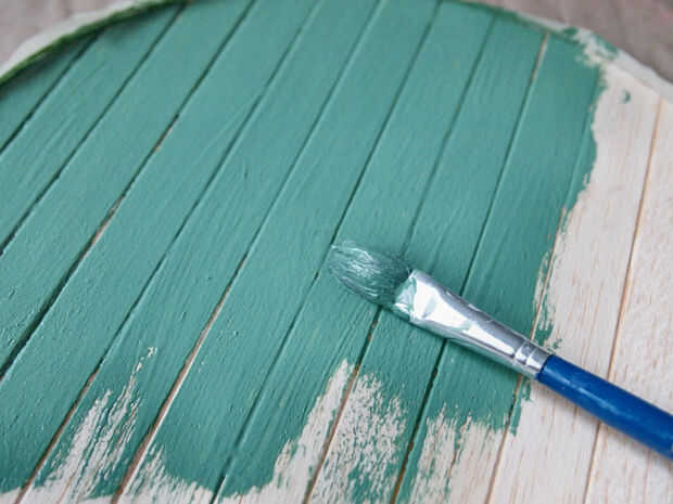 Para el interior de la puerta (dentro de la bolsa final) usé una pintura de color marrón del agua para teñir la madera. El exterior de la puerta he pintado con un color verde brillante. He pintado la parte exterior del marco de la puerta (cubierta de reloj) con pintura marrón.